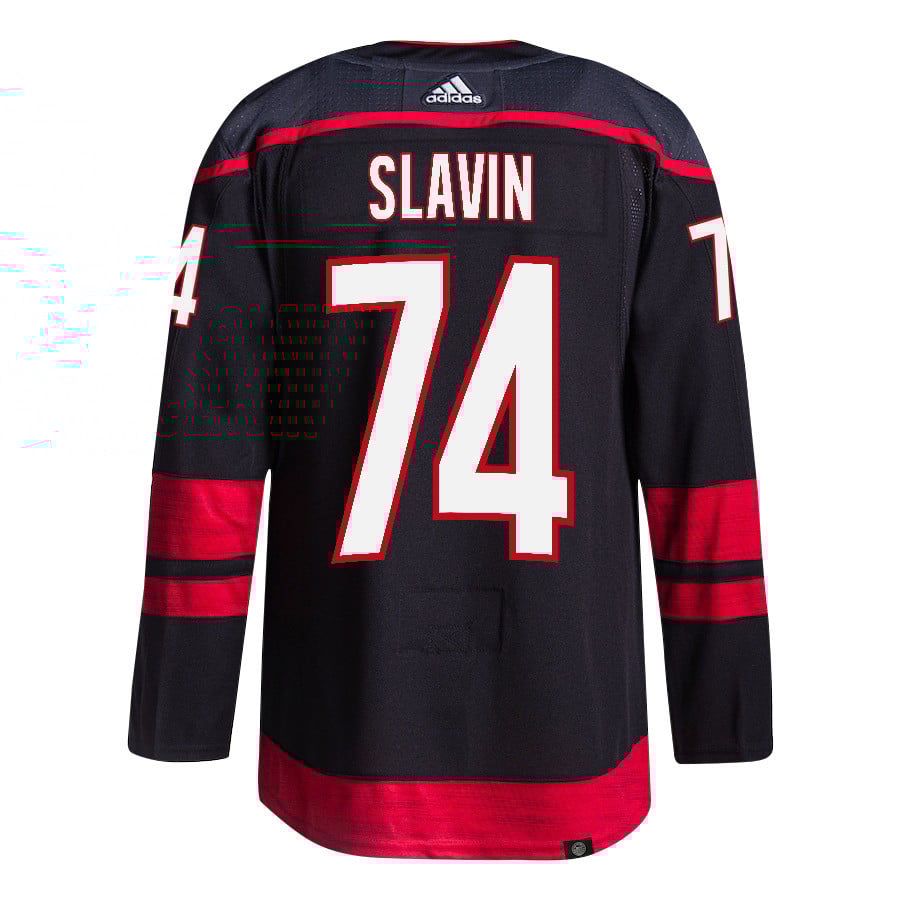 Jaccob Slavin 74 Carolina Hurricanes 2024 NHL Playoffs Patch Home Jersey – Men, Black – JS912