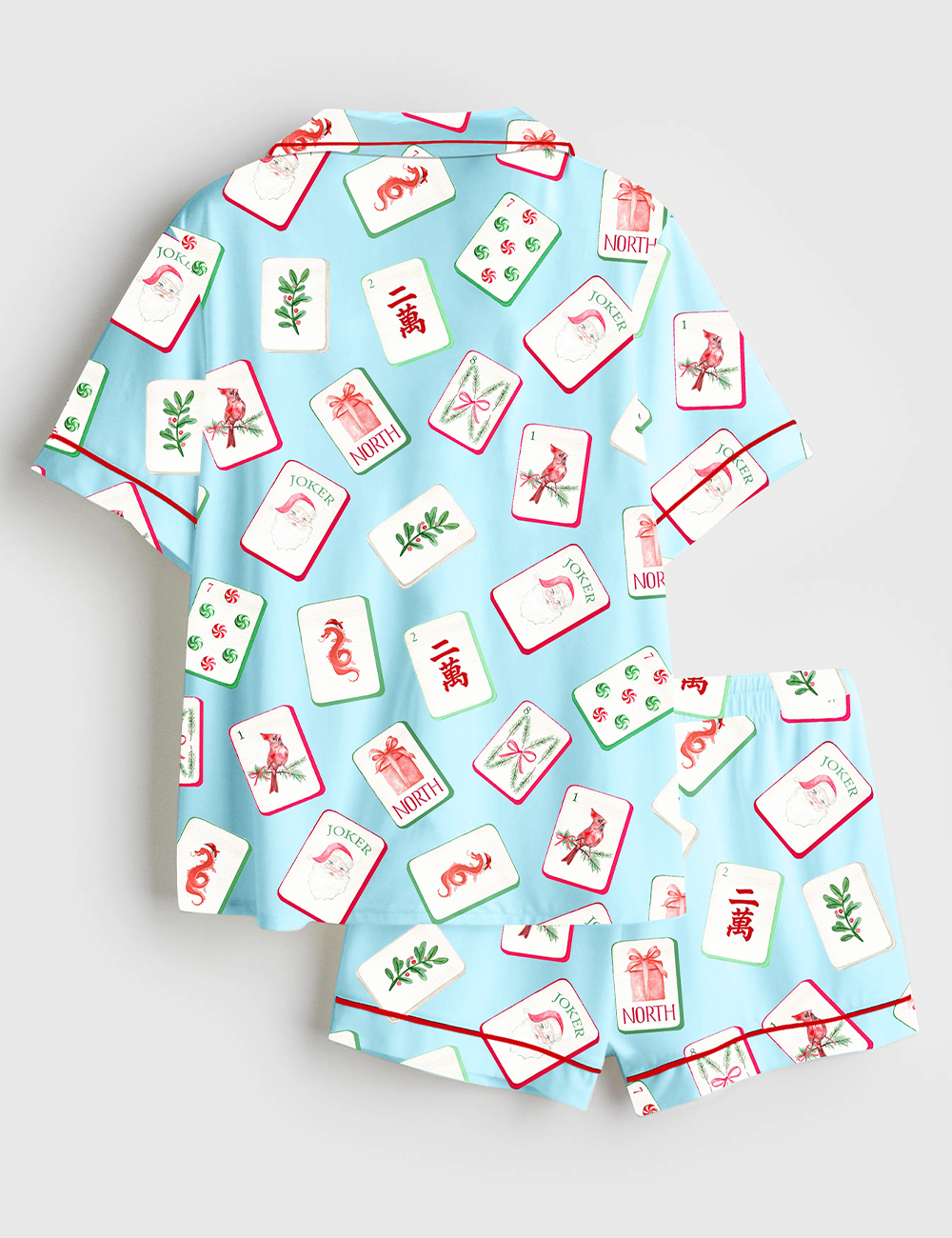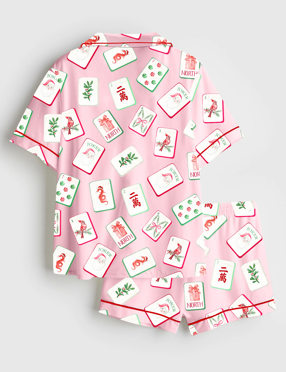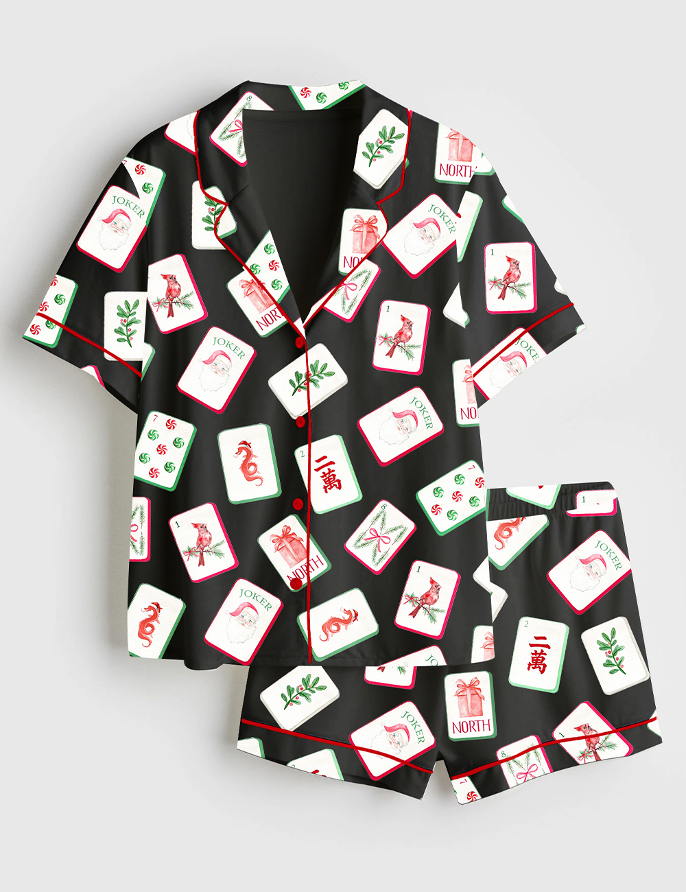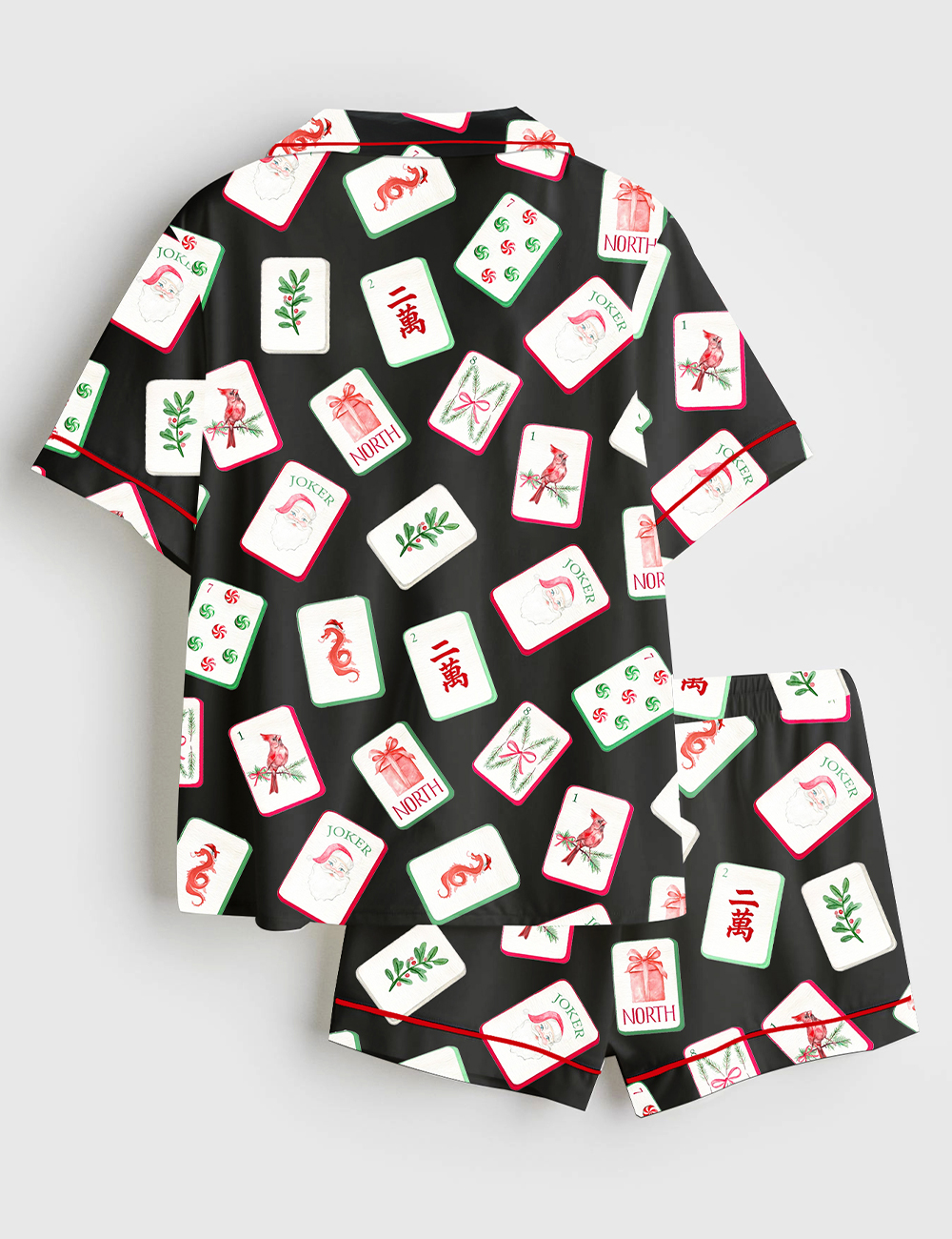 Men’s Watercolor Chinoiserie Millennial Mahjong Christmas Santa Party Short Sleeve Satin Pajama Set