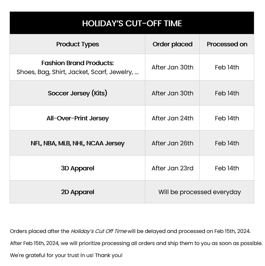 We invite fans to personalize select products, like jerseys, with custom text by entering your preferred name or message during ordering. Note that not all submissions are guaranteed approval – our Company may reject and cancel orders with offensive or inappropriate content at its discretion.